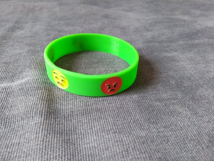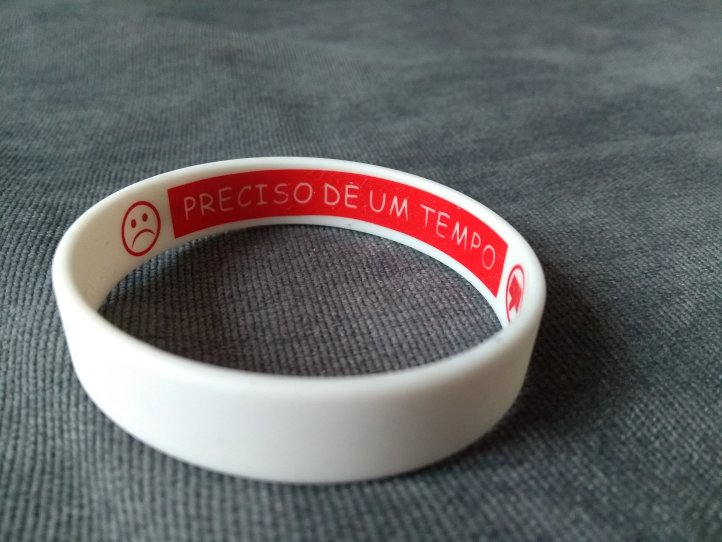 O bracelete “tudo bem” é mais simples e intuitivo. Ele serve para os momentos em que a comunicação verbal não é possível ou não é efetiva. Se está tudo bem, a criança deixa a pulseira do lado verde. Se ela precisa de alguma ajuda ou quer ser deixada em paz, ela pode virar o acessório do lado vermelho. Os próprios cuidadores podem virar o bracelete do lado vermelho caso percebam os primeiros sinais de irritação, para sinalizar para o usuário que ele deve fazer algo para voltar a ficar tranquilo.