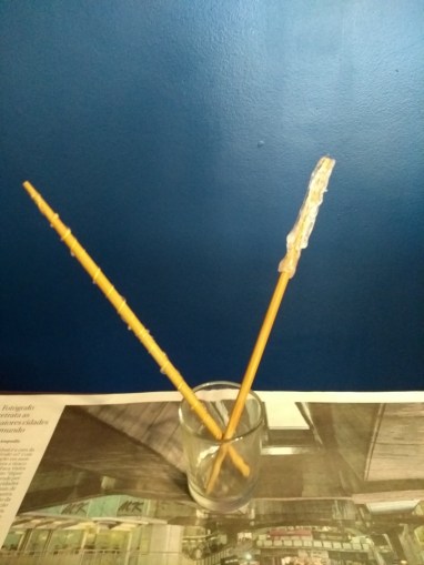 – Palitos de churrasco ou hashis de comida japonesa. Eu fiz com hashi.