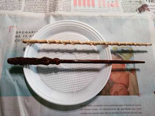1 – Apoie os palitos em um copo e use a cola quente para moldar como quiser. Procurei imagens de referência das varinhas de Harry e Hermione para ver como eram. A do Harry tem o punho mais grosso, então passei várias camadas de cola para fazer esse formato. A da Hermione é mais delicada e tem uns filetes como se fossem ramos de planta que “serpenteiam” pela varinha. Dica: para fazer a da Hermione, segure a pistola e gire o palito, em vez de girar a pistola. Espere secar.