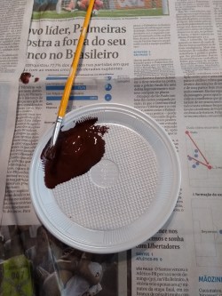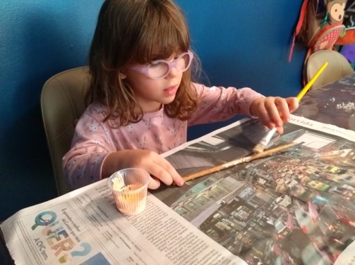 2 – Agora pinte as varinhas nas cores desejadas. Eu usei umas tintas que já tinha em casa, que acho que são guache. Mas acredito que o ideal para esse material seja tinta acrílica. A guache serviu, mas não cobriu o palito perfeitamente. Para fazer a cor da varinha do Harry, misturei vermelho com verde. Para fazer a da Hermione, peguei um rosa clarinha meio salmão que eu já tinha e misturei um tiquinho de amarelo. Deixe secar.