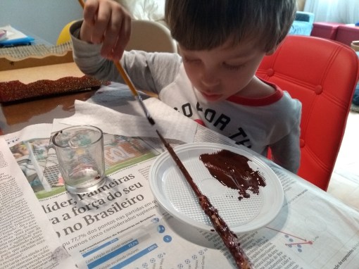 3 – As crianças quiseram decorar as varinhas com cola de glitter, então deixei que eles enfeitassem como quisessem. Espere secar bem.